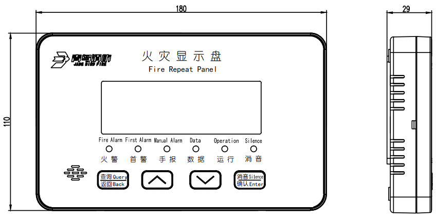 | 確 認(rèn) 燈 | 火警(紅色)、首警(紅色)、手報(bào)(紅色)、數(shù)據(jù)(紅色)、運(yùn)行(綠色)、消音(紅色) |