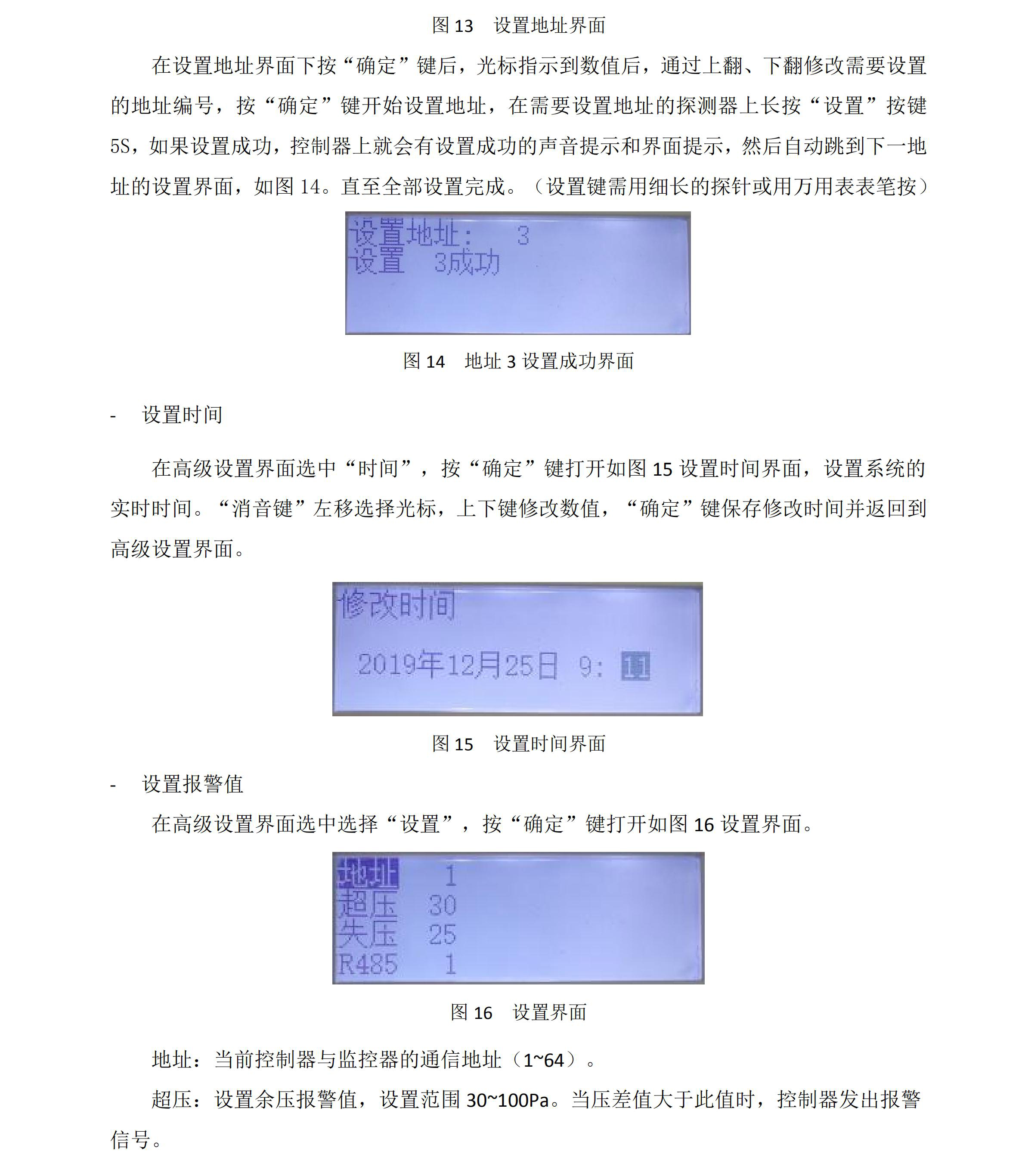 -控制器接收來自探測器的余壓報警信號,在 10s 內(nèi)發(fā)出聲、光報警信號,顯示報警探測器的地址,記錄報警時間。