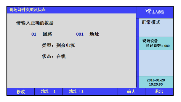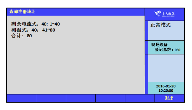 屏幕將顯示本回路被登記上線的剩余電流式探測器和測溫式探測的數(shù)量、地址和現(xiàn)場部件登記上線的總數(shù)信息。