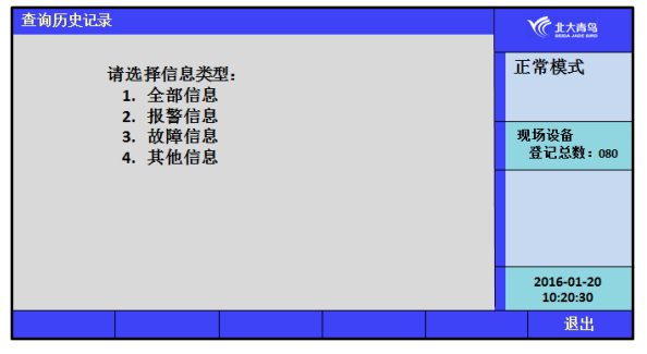 進入查詢菜單后,鍵入數(shù)字鍵【5】可以查詢歷史記錄信息,可查詢的信息包括:全部信息、報警信息、故障信息和其他信息,分別按數(shù)字鍵1~4可執(zhí)行響應的操作。