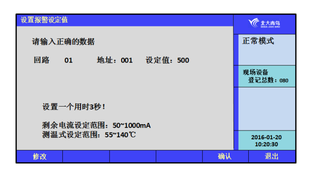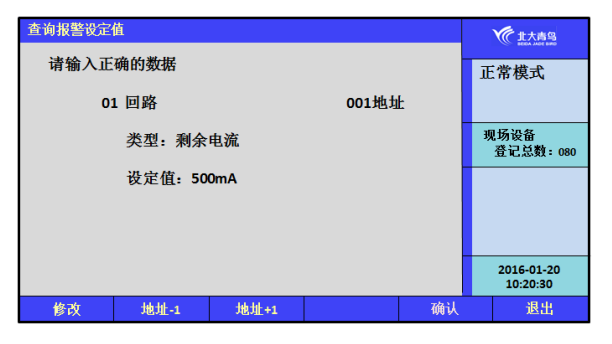 在安裝菜單中,鍵入【6】進入到“設置報警設定值”,在此界面中,可設置回路上任意地址探測器的報警設定值,剩余電流探測器的設定范圍為:50~1000mA;測溫式探測器設定范圍為:55~140℃,超出范圍不能進行設定。