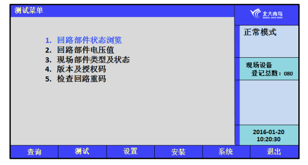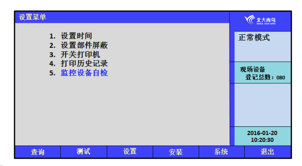 在設置菜單下,選擇【5】進入“監(jiān)控設備自檢”,監(jiān)控設備將進入自檢狀態(tài),啟動所有聲光顯示部件,自檢結(jié)束后回到“查詢系統(tǒng)現(xiàn)場部件狀態(tài)”界面。