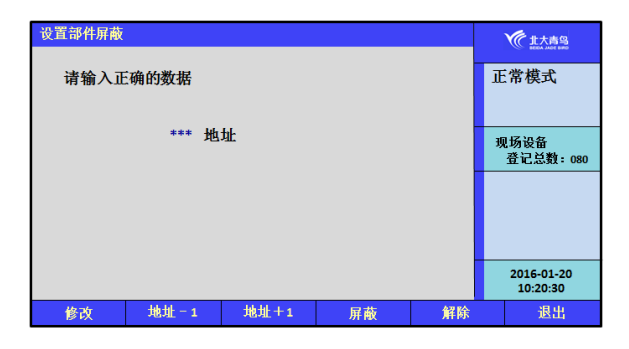 當系統(tǒng)中有現(xiàn)場部件發(fā)生故障,不能正常工作時,為了不對整個系統(tǒng)造成影響,需要將故障現(xiàn)場部件屏蔽。故障部件屏蔽操作界面如圖7.3.2所示,按屏幕提示輸入故障地址號,在選擇屏蔽按鈕后,該故障部件被屏蔽,監(jiān)控設備復位后不再報故障。當有現(xiàn)場部件被屏蔽時,面板屏蔽指示燈亮。待故障部件修復后,鍵入正確的數(shù)據(jù),可以解除部件屏蔽,如圖7.3.2所示。