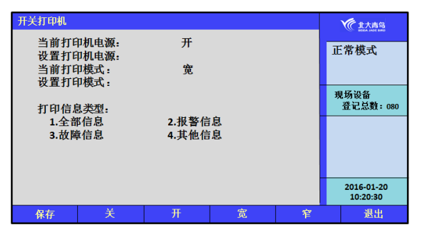 進入設置菜單,鍵入【3】進入“開關打印機”設置界面。在此界面可設置打印機的“開、關”;打印機的“寬窄”打印模式和“打印信息類型”,設置完成后按【保存】鍵完成操作。