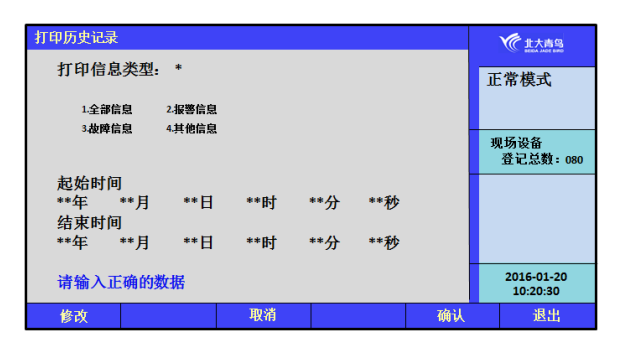 在設置菜單下,選擇【4】進入“打印歷史記錄”界面,用戶根據(jù)實際需要打印不同的時間點的各種類型的歷史信息,按【確認】鍵后完成打印。