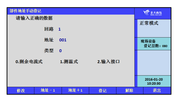 手動登記用于對單個部件地址的登記或清除,登記時現(xiàn)場部件可在線也可不在線,按如圖7.4.2提示,輸入要登記的回路號和地址號,通過按數(shù)字鍵選擇要手動登記的地址類型,然后選擇界面上的【登記】按鈕進行登記。被登記后,顯示屏會出現(xiàn)“地址已登記”提示。輸入要解除的部件回路號和地址號點擊【解除】按鍵,則已登記上線的部件地址被解除。若不接部件,在登記注冊完后,系統(tǒng)報故障,此時接入部件,故障即可恢復。