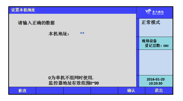 通過此菜單可以對本機的地址進行設置,單機運行時可不必進行地址設置,組網(wǎng)工作時監(jiān)控設備有效的地址范圍是1~99。