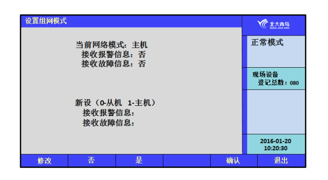 多臺電氣火災監(jiān)控設備可以聯(lián)網(wǎng),組成更大的監(jiān)控系統(tǒng),最多可以實現(xiàn)99臺監(jiān)控設備組網(wǎng)。如果是單臺監(jiān)控設備,此項不必操作。組網(wǎng)時,在此顯示頁中輸入監(jiān)控設備的模式—“主機或從機”,再選擇所接收的信息類型,然后按【確認】鍵。