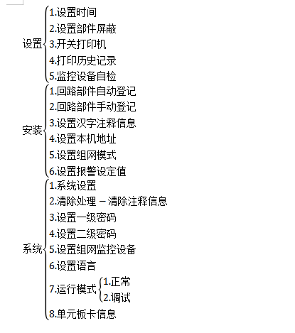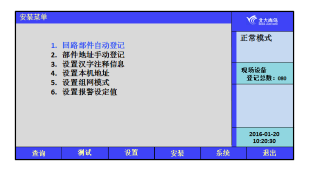 在安裝操作菜單中可以執(zhí)行以下操作:回路部件自動登記、回路部件手動登記、設置漢字注釋信息、設置本機地址、設置組網(wǎng)模式和設置報警設定值。