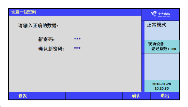 通過此菜單修改一級用戶密碼。在“設置密碼”處輸入修改后的密碼,在“確認新密碼”處再重新輸入一次進行檢驗,按面板上的【F5】確認或按【F1】修改。