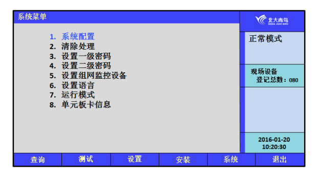 在系統(tǒng)操作菜單中可以執(zhí)行以下操作:系統(tǒng)配置、清除處理、設置一級密碼、設置二級密碼、設置語言、運行模式、單元板卡信息。