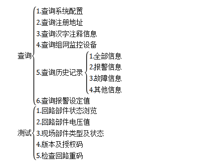 進入查詢選項菜單如圖7.1,在此菜單中你可以查詢到如下信息:系統(tǒng)配置、被登記的部件的總數(shù)及具體地址、各地址點漢字注釋信息、本機地址及組成網(wǎng)絡的各機器信息、存儲的歷史事件、各探測器設置的報警閾值等。