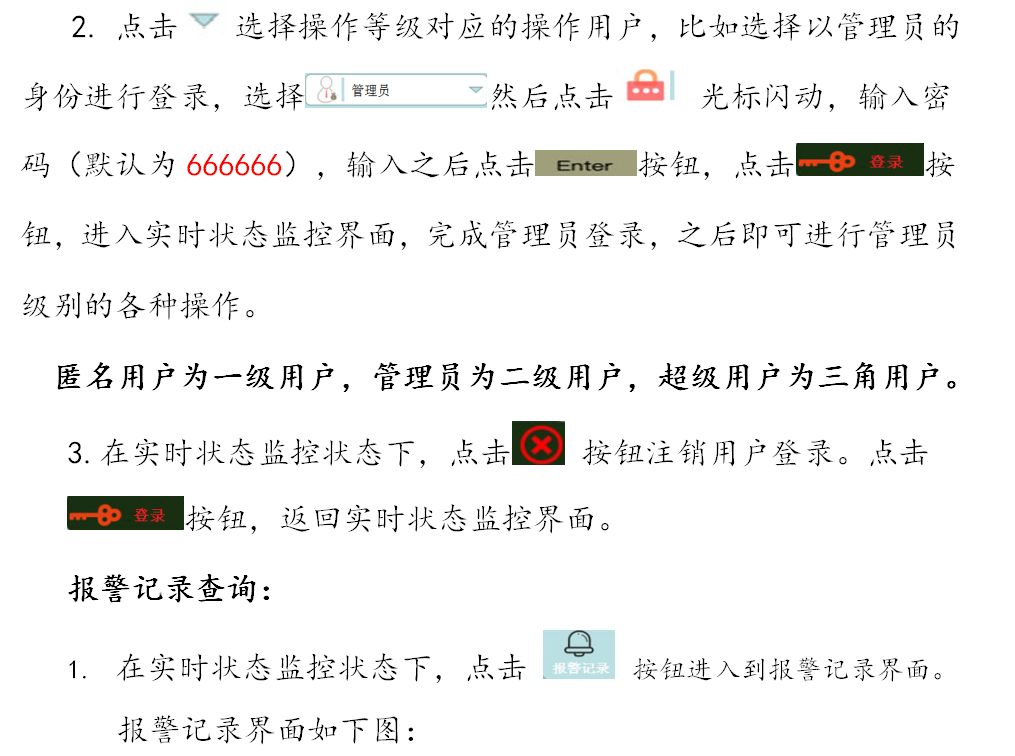 如果想進入到實時狀態(tài)控界面。點擊 X 即可進入到實時狀態(tài)監(jiān)控界面。系統(tǒng)在沒有登錄的情況下只能進行數(shù)據(jù)查詢,不能進行數(shù)據(jù)打印、參數(shù)設置等項目的操作,要進行這些項目的操作必須進入到登錄界面進行管理員登錄之后才能進行。
