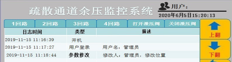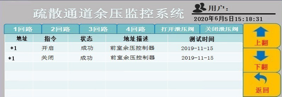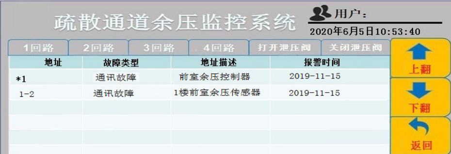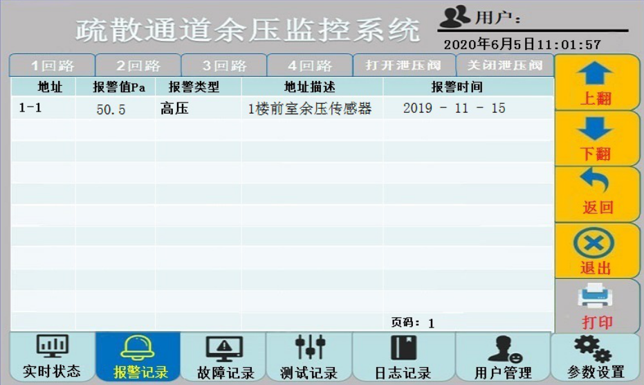 該界面實時顯示當前各個疏散通道的余壓值,泄壓閥的狀態(tài),系統(tǒng)時間,用戶類型等信息。通過點擊相關控制按鈕可進行數(shù)據(jù)查詢、打印、翻頁等控制。“1回路”-“4回路”指監(jiān)控器的通訊通道號,每個通道可以與多個余壓控制器連接實現(xiàn)通訊;“打開泄壓閥”、“關閉泄壓閥”控制按鈕可遠程控制當前查詢回路的泄壓閥;“地址號”顯示對應通道連接的控制器及傳感器的地址碼;“實時數(shù)據(jù)”顯示對應監(jiān)控點的余壓值,單位為Pa;“運行狀態(tài)”顯示控制器、傳感器的工作狀態(tài);“泄壓閥狀態(tài)”顯示泄壓閥的當前狀態(tài);“地址描述”顯示對應地址碼的控制器或傳感器的文字描述(文字描述修改需要通過監(jiān)控器與電腦連接實現(xiàn)文字編輯)。“*1”為1#控制器的地址碼,“1-1”表示與1#控制器連接的1#傳感器地址碼。