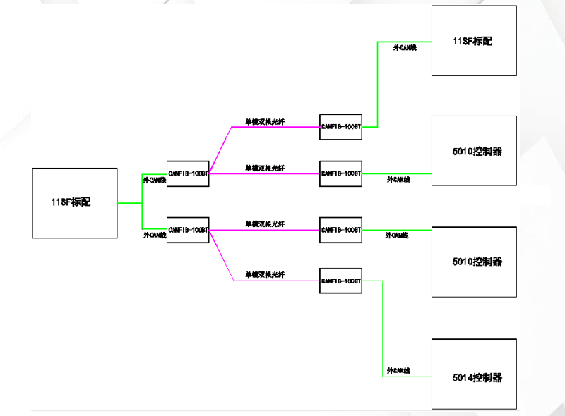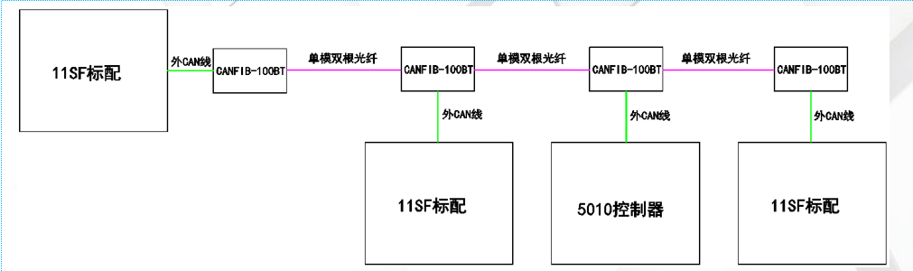 控制器之間通過CANFIB-100BT CAN轉(zhuǎn)光纖接口模塊,采用“星型” 或“手拉手” 方式進(jìn)行組網(wǎng);