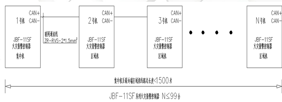 2、通過報警總線接入報警回路,一臺控制器占一個地址點;