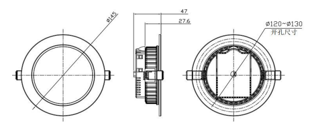 在圖紙設(shè)計位置,按照圖示建議開孔尺寸開孔,按照上圖接線方法接線,將兩彈簧卡扳向燈具尾部出線方向,將燈具尾部塞入安裝孔,確保燈具牢固美觀。