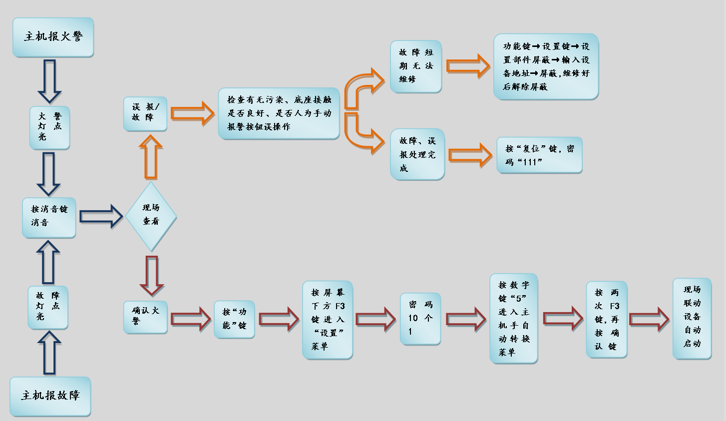 北大青鳥消防設(shè)備火災(zāi)報(bào)警主機(jī)主動(dòng)報(bào)警時(shí):火警燈點(diǎn)亮,確認(rèn)火警后按照步驟圖操作。